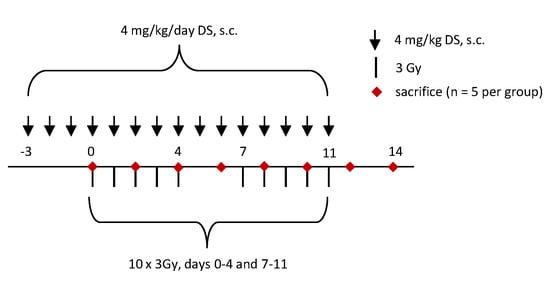Experimental design. Daily fractionated irradiation was given in 10 fractions with 3 Gy per day over two weeks, including an irradiation-free weekend (days 5 and 6). Irradiation was either applied alone (group: IR) or in combination with daily 4 mg/kg dermatan sulfate (DS) treatment from day-3 before the start of irradiation (day 0) until sacrifice (group: IR + DS). 5 animals per experimental group were sacrificed in two days intervals.