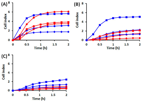 Kinetics of cell adherence and spreading for HaCaT (red plots) and DOK (blue plots) cells, on various matrix proteins, at different concentrations. (A) Collagen; (B) fibronectin; (C) laminin; diamonds—2.5 µg/mL, circles—5 µg/mL, squares—10 µg/mL.