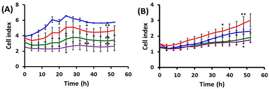 Kinetics of cell adherence, spreading and proliferation for keratinocytes after UVA irradiation on 5 µg/mL collagen. (A) HaCaT; (B) DOK; blue plots—mock-irradiated cells; red plots—15 min irradiation; green plots—30 min irradiation; purple plots—60 min irradiation. * p < 0.05, ** p < 0.01.