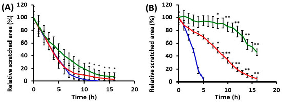 Effects of UVA exposure on the motility of keratinocytes, in terms of their ability to re-cover the scratched area. (A) HaCaT; (B) DOK. Blue plots—mock-irradiated cells; red plots—cells after 30 min irradiation; green plots—cells after 60 min irradiation. * p < 0.05, ** p < 0.01.