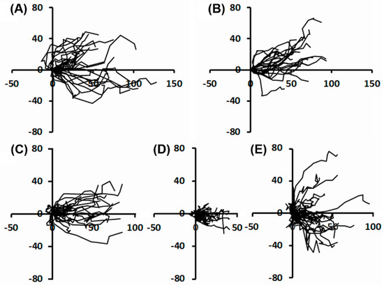 Effects of UVA exposure on the motile ability of keratinocytes, in terms of their directionality of movement. (A) Trajectories of mock-irradiated HaCaT cells during the first 5 h after scratching; (B) trajectories of HaCaT cells irradiated for 30 min, during the first 5 h after scratching; (C) trajectories of mock-irradiated DOK cells during the first 5 h after scratching; (D) trajectories of DOK cells irradiated for 30 min, during the first 5 h after scratching; (E) trajectories of DOK cells irradiated for 30 min, monitored between 5 and 13 h after scratching. Units in plots are in μm.