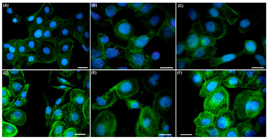 Effects of 60 min UVA exposure on actin cytoskeleton reorganization in keratinocytes. (A–C)—HaCaT; (D–F)—DOK. (A,D)—mock-irradiated cells; (B,E)—cells right after irradiation; (C,F)—cells 2 h post-irradiation. Actin filaments are marked in green; nuclei are in blue. Scale bars represent 10 μm.