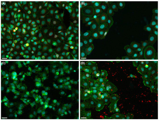 Effects of 60 min UVA exposure on the focal contacts of keratinocytes as revealed by anti-FAK immunofluorescence (in red). (A,B)—HaCaT; (C,D)—DOK. Note that UVA exposure had very few effects on normal keratinocytes (compare (A), for mock-irradiated cells, with (B) for exposed cells followed by scratching), while UVA radiation increased the strength of focal contacts in DOK cells resulting in many focal contacts extracted from the cells remaining attached to the culture surface in the scratched area. Nuclei are marked in blue with DAPI; actin filaments are in green. Scale bars represent 50 µm.