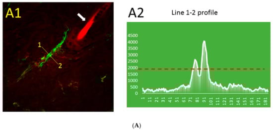 Distribution pattern of Aβ (green) immunofluorescence and blood vessel (red) fluorescence in thrombotic (A1) and control (B1) skin and the Aβ peptide profile (along line segment 1–2) in thrombotic (A2) and control (B2) skin in 0.5 µm steps. Green, immunofluorescence bound to Aβ peptide; red, Rose Bengal dye fluorescence bound to the luminal surface of blood vessels. Arrows, hair bulbs with visible hair shafts. The dashed red line in (A2) and (B2) indicates the intensity threshold of the green channel used in (A1) and (B1). Bar, 20 µm.