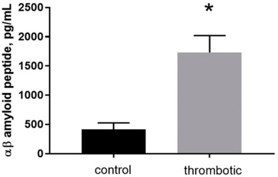 The concentration of free mouse Aβ40 peptide determined by enzyme-linked immunosorbent assay (ELISA) in control and thrombotic skin homogenate (pg/mL). Mean ± S.E. and significant differences between groups (*) are shown (p < 0.05).