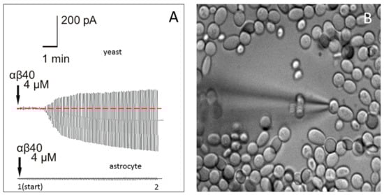 Patch-clamp measurements with electrodes filled with synthetic Aβ40 were used in order to evaluate the effect of Aβ40 on membrane conductance in microorganisms. Yeast cells were selected as a model, because these microorganisms have the cell size and other characteristics that allow for the measurement of external membrane conductance using the patch-clamp technique (Figure 4B). Fine-tip electrodes (~10–12 MΩ tip resistance) were employed in the cell-attached voltage-clamp configuration without rupturing the cellular membrane. In this configuration, the cell is attached to the electrode with holding potential U, which is changed according to the protocol.