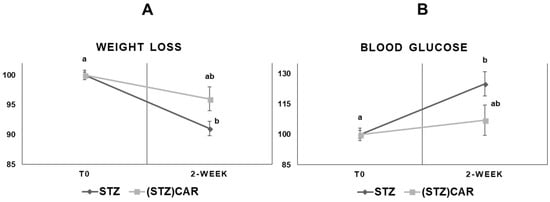 Weight loss (A) and blood glucose levels (B) in mice that underwent STZ treatments in the absence and presence of CAR oral administration. Relative (%) weight and blood glucose concentrations after two weeks from overt hyperglycemia [T0, 100%]. Overt hyperglycemia refers to the condition of STZ-treated mice showing sustained blood glucose concentration ≥ 250 mg/dL for at least seven days (see Materials and Methods Section 4.1). STZ: STZ-treated, hyperglycemic mice; (STZ)CAR: STZ-treated mice underwent a two-week CAR administration (1 g/L in drinking water). Values refer to the mean (±S.E.M.) of n = 5 individuals. Statistical analysis: t-Student; different letters indicate significantly different values (p < 0.05).