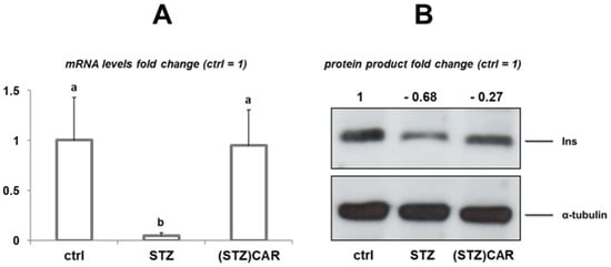 In STZ and (STZ)CAR mice the expression of the Ins1 mRNA was studied by qPCR, compared to the untreated controls. In the STZ hyperglycemic mice group, a significant downregulation (negative fold change of −0.95 ± 0.03) was detected compared to the control (ctrl; fold change 1 ± 0.43), whereas in the (STZ)CAR mice no significantly different mRNA levels were detected (negative fold change −0.05 ± 0.35; Figure 2A). Accordingly, the expression of the insulin protein product in the pancreatic tissue of the STZ experimental group was strongly down-regulated (−68 ± 0.15 negative fold change) vs. the control (Figure 2B), whilst in the (STZ)CAR group the downregulation occurred to a lesser extent (−0.27 ± 0.12 negative fold change).