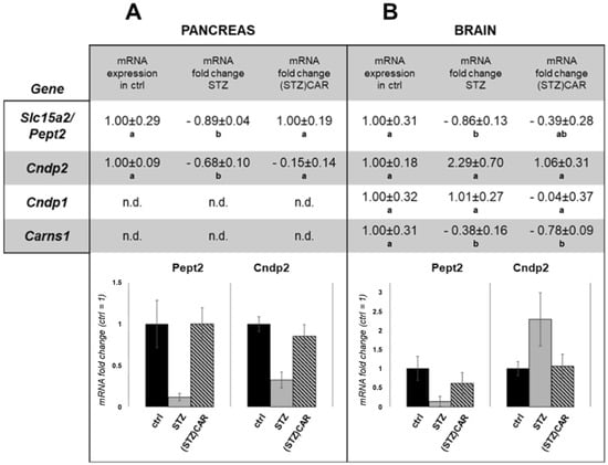 qPCR analysis of the mRNAs of genes related to CAR homeostasis (Slc15a2/Pept2, Cndp2, Cndp1 and Carns1), in the pancreas (A) and brain (B) of hyperglycemic mice undergone STZ treatment. Ctrl: untreated control mice; STZ: hyperglycemic mice; (STZ)CAR: hyperglycemic mice orally administered with CAR. Each mRNA target expression derives from the value of the 2−ΔCt function (Ct, Threshold cycle) normalized respect to the 28S RNA []. n.d.: not detected mRNA expression. Histograms below emphasize the expression variations for the two mRNAs found in both tissues (i.e., Slc15a2/Pept2 and Cndp2). Values are expressed as fold change with respect to control (fold change 1). Statistical analysis: one-way ANOVA, post hoc test by Bonferroni. Different letters (a, b) indicate significantly different values (p < 0.05; n = 5).