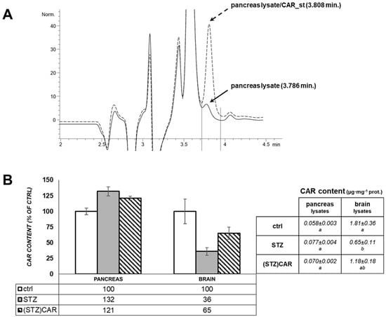 CAR detection in the pancreas and brains of mice that underwent STZ treatments. Analysis of CAR content by HPLC on deproteinized extracts of pancreas and brain lysates from control (ctrl), STZ and (STZ)CAR mice. (A) Representative chromatograms for the lysates from control pancreas (upper figure) and for the pancreas lysate 1:1 mixed with a CAR standard solution (1 µg/mL) in ultrapure water. Peaks and elution times are pointed by the red arrows. (B) Normalized concentrations of CAR per mg of total protein in the starting pancreatic extracts are expressed in the histograms as percent values with respect to the control (100%). Values are the mean of n = 3 (±S.E.M.) biological replicates. Different letters (a, b) indicate statistically different values (t-student test; p < 0.05).