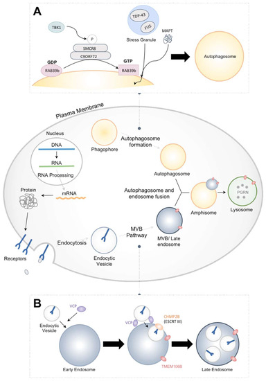 Role of proteins associated with frontotemporal dementia (FTD) in endosomal–lysosomal and autophagy pathway. FTD associated proteins, highlighted in yellow, are involved in both autophagy and endosomal–lysosomal pathways. (A) Phagophores in the cytoplasm undergo autophagosome formation with the assistance of C9ORF72, TANK binding kinase 1 (TBK1), microtubule-associated protein tau (MAPT), transactive DNA-binding protein (TDP-43), and fused in sarcoma (FUS) proteins, as well as various other protein complexes not included in the figure above. (B) Endocytic vesicles bearing receptor cargo transition through maturation stages to form MVBs and eventually fuse with the lysosomes. ESCRT complexes and additional proteins, including valosin containing protein (VCP) and transmembrane protein 106B (TMEM106B), contribute in the development of the endosome and MVB pathway in the endosomal–lysosomal pathway.
