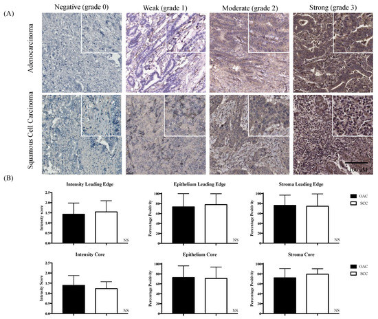 When examining the percentage positivity epithelium multiplied by percentage positivity stroma, the following results were obtained. For the leading edge, only comparing the scores of OAC vs. SCC, there was no significant difference (p = 0.58); for the core scores, comparing OAC and SCC, there was no significant difference (p = 0.66); and when combining the leading edge and the core scores, there was no significant difference (p = 0.9).