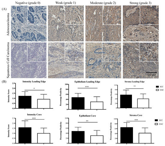 Tissue microarray grading and IL-6R values in OAC and SCC. (A) Paraffin-embedded tissue microarrays of oesophageal adenocarcinoma and squamous cell carcinoma were stained using immunohistochemistry for the IL-6R expression. The intensity was scored from 0–3, where 0 was negative, grade 1 was weak, grade 2 was moderate, and grade 3 was strong staining. In addition, the percentage positivity in the epithelium and stroma were attributed a score of 0, 10, 25, 50, 75, 90, or 100%. The magnification was 10×. Further magnification of images is shown in the upper right of each example. (B) The mean values of intensity and positivity of pSTAT3 in the OAC and SCC leading edge and core specimens. Statistical analysis using Mann–Whitney U testing. Differences of p < 0.05 (*), p < 0.01 (**), and p < 0.001 (***) were considered statistically significant.