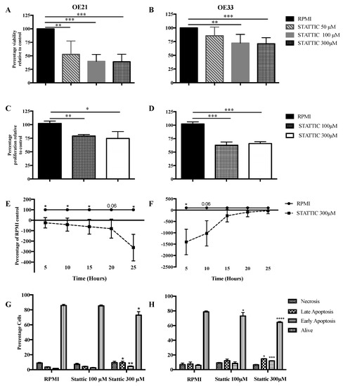 The treatment of the OE21 cells with STATTIC, 100 μM, did not result in any significant alterations in the early or late apoptosis or necrosis, relative to the RPMI control. Treatment with STATTIC, 300 μM, resulted in a significant increase in the early (p = 0.0049) and late apoptosis (p = 0.04), and a significant decrease in the live cells (p = 0.03), relative to the RPMI control (Figure 4G). The OE33 cells that were treated with STATTIC, 100 μM, demonstrated a trend for increased early apoptosis, however, this did not reach significance (p = 0.06). There was no difference in the late apoptosis (p = 0.09) or necrosis (p = 0.2), relative to the RPMI control. There was, however, a significant decrease in the live cells (p = 0.04), relative to the RPMI. The treatment of OE33 cells with 300 μM STATTIC resulted in a significant increase in early apoptosis (p = 0.0004) and late apoptosis (p = 0.02). Additionally, there was a significant decrease in the live cells (p < 0.0001), relative to the RPMI control (Figure 4H).