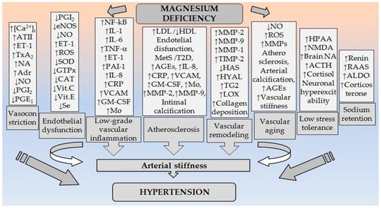 Pathogenetic relationships between MgD and arterial hypertension. (Abbreviations: ↑: increased; ↓: decreased; [Ca2+]i: intracellular calcium in VSMCs; ATII: angiotensin II; ET-1: endothelin-1; TxA2: thromboxane A2; NO: nitric oxide; PGE1: prostaglandin E1; PGI2: prostaglandin I2; ROS: reactive oxygen species; NF-kB: nuclear factor kappa B; TNF-α: tumor necrosis factor-α; IL-1: interleukin-1; IL-6: interleukin-1; IL-8: interleukin-8; PAI-1: plasminogen activator inhibitor-1; VCAM: vascular cell adhesion molecule-1; GM-CSF: granulocyte-macrophage colony-stimulating factor; Mo: monocytes; CRP: C-reactive protein; SOD: superoxide dismutase; GTPx: glutathione peroxidase; CAT: catalase; Vit.C: vitamin C; Vit.E: vitamin E; Se: selenium; LDL: low-density lipoproteins; HDL: high-density lipoproteins; MetS: metabolic syndrome; T2D: type 2 diabetes; AGEs: advanced glycation end products; MMPs: matrix metalloproteinases; MMP-1: matrix metalloproteinase-1; MMP-2: matrix metalloproteinase-2; MMP-9: matrix metalloproteinase-9; TIMP-2: tissue inhibitor of metalloprotease-2; HAS: hyaluronan synthases; HYAL: hyaluronidase; TG2: transglutaminase; LOX: lysyl oxidase; HPAA: hypothalamic pituitary adrenal axis; NMDA: N-methyl-d-aspartate receptor; NA: noradrenaline; Adr: adrenaline; ACTH: adrenocorticotropic hormone; RAAS: renin-angiotensin-aldosterone system; ALDO: aldosterone).
