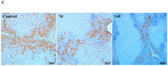 On Days 3 and 7 after CCl4 treatment, serum was isolated by orbital venous plexus blood collection. Serum AST and ALT levels were detected by standard enzymatic assay kits. The highly-colored end product was measured at 490–520 nm by a spectrophotometer (Hitachi 736–10, Beijing, China). The absorbance of each end product is proportional to the enzyme’s activity. TNF-α and interleukin-1β (IL-1β) expression levels in livers were measured by ELISA kits (R&D Systems, Minneapolis, MN, USA) following the manufacturer’s instructions.
