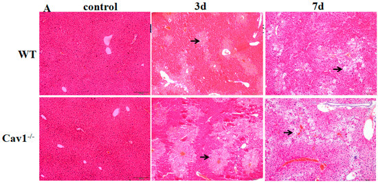 Growing evidence has linked inflammation to tissue damage and liver fibrosis in conditions such as drug-induced liver injury, alcoholic steatohepatitis, and nonalcoholic steatohepatitis [27,35,36,37]. We measured increased degeneration and necrosis of hepatocytes in Cav1−/− and WT mice three and seven days post injury but the increase was more significant in the Cav1−/− mice. Similarly, ALT/AST, TGF-α and IL-1β Levels in Cav1−/− mice were higher than that in WT mice. A previous report showed that Cav1 is essential for protecting against binge drinking-induced liver damage by inhibiting reactive nitrogen species [37], and our findings also suggest that Cav1 plays an important role in reducing CCl4-induced liver injury. Similarly, Cav1 deletion exacerbates cardiac interstitial fibrosis by promoting M2 macrophage activation in mice after myocardial infarction. It has been confirmed the reason is that M2 macrophages, known for promoting scar formation, accumulate more in Cav1−/− mice compared to WT mice. Further studies showed that the survival rate in Cav1−/− mice that received macrophages from WT mice was increased and survival rates for WT mice which received Cav1−/− macrophages were decreased [25].