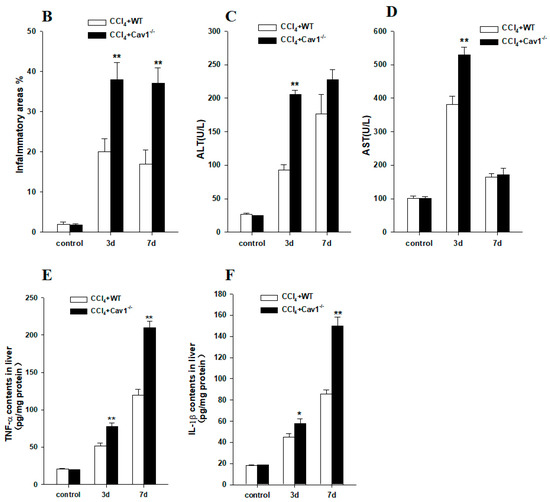 To investigate the role of Cav1 in CCl4 induced inflammation in livers, we measured the histopathological lesions of livers in Cav1−/− and WT mice following CCl4 injection. There was no spontaneous inflammation in the control Cav1−/− livers. Degeneration and necrosis of hepatocytes were observed in Cav1−/− and WT mice after three and seven days (Figure 2A). There were significantly more areas of degeneration and necrosis in Cav1−/− mice than in WT (** p < 0.01, Figure 2B). Similarly, the ALT and AST levels in Cav1−/− mice were also significantly higher than that in WT animals three days after CCl4 treatment (** p <0.01, Figure 2C,D). As shown in Figure 2E,F, pro-inflammatory cytokines of TGF-α and IL-1β were highly induced in Cav1−/− compared to WT mice (** p <0.01, * p <0.05, Figure 2E,F). These data suggest that Cav1 deficiency aggravates inflammatory extent of CCl4-induced liver injury.