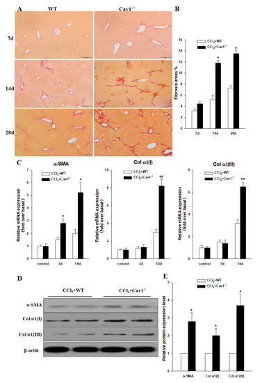 To evaluate the role of Cav1 in the progress of liver fibrosis, Cav1−/− and WT animals were treated with CCl4 to induce liver fibrosis. After 7, 14, and 28 days, liver tissues were collected for histopathology examination. As shown in Figure 3A, the results of Sirius Red staining revealed that there was no difference between Cav1−/− and WT animals in collagen deposition on Day 7. However, the collagen deposition in livers was significantly increased in Cav1−/− compared with WT animals on Days 14 and 28 (Figure 3B, * p < 0.05).