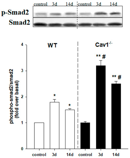 To evaluate whether Cav1 regulates activation of TGF-β1/Smad signaling, we measured the protein expression levels of p-Smad2 and total Smad2 in livers of both Cav1−/− and WT mice by Western blot. The results indicated that p-Smad2 expression levels were increased and total Smad2 levels remained the same in livers after CCl4 treatment for 3 and 14 days in WT mice. Interestingly, this increase was enhanced in the Cav1−/− livers compared to WT (Figure 4, ** p < 0.01, * p < 0.05 compared to control in the same strain; # p < 0.05 compared to WT). The increased ratio of p-Smad2 to Smad2 indicates the activation of TGF-β1/Smad signaling. Therefore, these results indicate there is an inverse correlation between the expression of Cav1 and the activation of TGF-β1/Smad signaling in the progress of liver fibrosis.