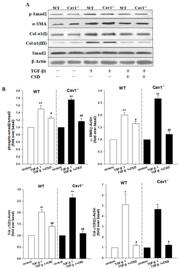 In this study, we hypothesized that Cav1 deficiency would enhance TGF-β1/Smad signaling and CSD could inhibit the progression of liver fibrosis by restoring the inhibitory effect of Cav1. A mouse model induced by carbon tetrachloride was used to identify the role of Cav1 in activation of hepatic stellate cells (HSCs) and collagen production in the progress of liver fibrosis. We also studied TGF-β1/Smad signaling in isolated HSCs from Cav1 deficiency and WT mice.
