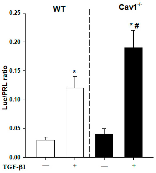Enhanced activity of TGF-β1 signaling in Cav1−/− HSCs Primary mouse HSCs extracted from WT and Cav1−/− mice were cotransfected with SMAD luciferase reporter plasmid and pRL-TK vector. Twenty-four hours after transfection, cells were treated with TGF-β1 (5 ng/mL) for another 24 h. Luciferase activity was determined with the commercial luciferase reporter assay system. Each value represents the mean ± SD of at least three independent transfection experiments, each performed in triplicate. * p < 0.05 compared with no TGF-β1 group for the same strain; # p < 0.05 compared with TGF-β1-treated HSCs in WT mice.