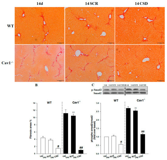 To identify Cav1 as an important negative regulator in the process of liver fibrosis, we delivered CSD to WT and Cav1−/− animals following CCl4 treatment and assessed whether CSD could inhibit the progress of fibrosis. The results of Sirius Red staining revealed that collagen production was significantly reduced in both WT and Cav1−/− mice treated with CSD, compared to mice that were treated with SCR (** p < 0.01 vs. 14-day SCR in WT; ## p < 0.01 and # p < 0.05 vs. 14-day SCR in the same strain, Figure 7A,B). There was no significant difference in collagen deposition between the SCR and control group. More interestingly, the decrease of collagen deposition was more enhanced in the Cav1−/− mice after treatment with CSD compared to WT. Furthermore, we also found that animals treated with the CSD had decreased ratio of p-Smad2 to Smad2 (** p < 0.01 vs. 14-day SCR in WT; ## p < 0.01 and # p < 0.05 vs. 14-day SCR in the same strain, Figure 7C). These data indicated that Cav1 negatively regulated the activation of TGF-β1/Smad signaling.