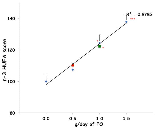 Plasma n-3 highly unsaturated fatty acids (HUFA) scores of subjects fed with 0.0, 0.5, 1.0, and 1.5 g/day of fish oil (FO) (◆ blue diamond) or 90 g/day of sheep-1-ENCH cheese for two weeks (■ red squares) and four weeks (■ green squares). The data are expressed as mean ± SEM per group; * p < 0.05; *** p < 0.001 versus baseline (time 0).