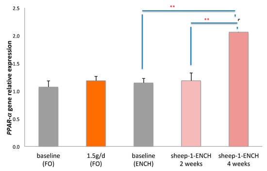 Since n-3 HUFA, particularly DHA and CLA, are PPAR-α ligands [], we also evaluated the relative expression levels of the PPAR-α gene. PPAR-α gene expression analysis indicated a significant two-fold increase following dietary intervention with 90 g/day of sheep-1-ENCH cheese for four weeks (p < 0.01) when compared to the baseline or to the intake for two weeks of sheep-1-ENCH cheese (p < 0.01). However, there were no significant differences following the intake of the FO supplement at 1.5 g/day (Figure 2).
