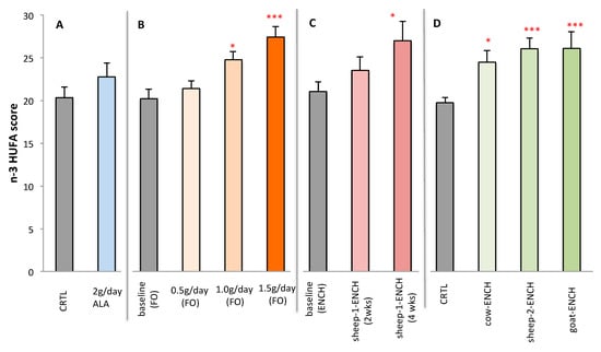 Plasma n-3 HUFA scores of subjects administered different treatments: (A) CRTL control (4 g/day olive oil) and 4 g/day linseed oil (~2 g of ALA), n = 12/group; (B) 0.5 g/day, 1.0 g/day and 1.5 g/day of FO for 2wo weeks, n = 15/group; (C) 90 g/day of sheep-1-ENCH cheese for two and four weeks, n = 15/group; (D) 50 g/day of different ENCH or CRTL cheeses for two months, n = 36/group. The data are expressed as mean ± SEM per group; * p < 0.05; *** p < 0.001 versus baseline (time 0) or control group.