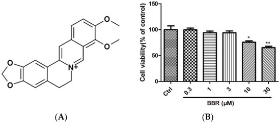 Previously, we successfully created an H2O2-induced RPE cell injury model with D407 cells to screen potential protectants from a library of active components of various Chinese medicines [22]. Berberine (BBR, the structure of BBR is shown in Figure 1A), is a natural alkaloid compound derived from Coptis chinensis, is found to efficiently increase the D407 cells’ viability from the damage caused by H2O2 exposure between various Chinese medicines in our lab. For decades, BBR has been widely used in China as a medication for diarrhea. Various clinical studies conducted in the recent years have shown its therapeutic potential in many types of chronic diseases [23]. Accumulated studies suggested that BBR is endowed with several pharmacological activities, including anti-tumor activity [24], cardiovascular-protective actions [25,26], anti-inflammatory effects [27] and it has also been found to inhibit the expression of inflammatory cytokines in ARPE-19 cells cultured in the presence of TNF-α [28]. In addition, BBR also exhibited various other biological effects such as glucose regulation and lipid metabolism in vitro and in vivo [29,30]. However, whether BBR exerts any protective effects against H2O2 insult in RPE cells and the underlying mechanisms are still unknown.