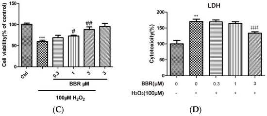 Protective effects of berberine (BBR) against H2O2-induced cytotoxicity in D407 cells. (A) The structure of BBR; (B) D407 cells were treated with BBR (0.3 to 30 µM) or 0.1% dimethyl sulfoxide (DMSO) (vehicle control) for 24 h and cell viability was measured using 3-(4,5-dimethylthiazol-2-yl)-2,5-diphenyl tetrazolium bromide (MTT) assay. Cells were pre-treated with BBR at indicated concentration or 0.1% DMSO (vehicle control) for 2 h and then incubated with or without 100 µM H2O2 for further 24 h. Cell viability and the release of lactate dehydrogenase (LDH) were measured by MTT assay (C) and LDH assay (D), respectively. * indicates p < 0.05, ** indicates < 0.01, *** indicates p < 0.001 versus the control group; # indicates p < 0.05, ## indicates p < 0.01 versus the H2O2-treated group were considered significantly different.