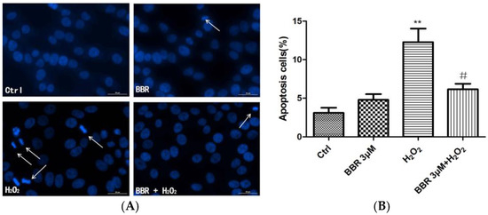 BBR attenuated H2O2-induced apoptosis in D407 cells. Apoptosis of D407 cells was detected by Hoechst 33342 staining and visualized by fluorescence microscopy. The number of apoptotic nuclei with condensed chromatin was counted from the photomicrographs and presented as a percentage of the total number of nuclei. ** indicates p < 0.01 versus the control group; # indicates p < 0.05 versus the H2O2-treated group were considered significantly different.