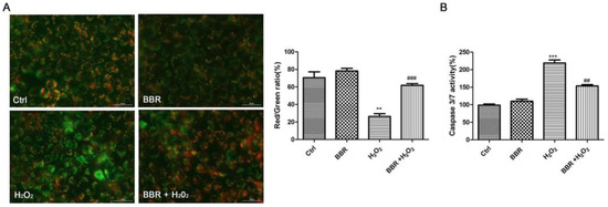 BBR attenuated H2O2-induced loss of mitochondrial membrane potential (Δψm) and activation of caspase 3/7 in D407 cells. After pre-treatment with 3 μM BBR or 0.1% DMSO (vehicle control) for 2 h, D407 cells were incubated with or without 100 μM H2O2 for another 24 h. (A) Δψm was determined by JC-1 assay; (B) Quantification of caspase 3/7 activity was determined by caspase 3/7 activity assay. ** indicate p < 0.01, *** indicate p < 0.001 versus the control group; ## indicate p < 0.01, ### indicate p < 0.001 versus the H2O2-treated group were considered significantly different.