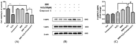 AMPK specific inhibitor Compound C blocked the protective effect of BBR in D407 cells. (A) D407 cells were pre-treated with 5 µM Compound C for 30 min and 3 µM BBR for 2 h and then incubated with or without H2O2 for a further 24 h. Cell viability was measured by MTT assay. * indicates p < 0.05. ** indicates p < 0.01, *** indicates p < 0.001 was considered significantly different; (B) D407 cells were pre-treated with 5 µM Compound C for 30 min and 3 µM BBR for 80 min and then incubated with or without H2O2 for a further 2 h. The expression of phosphorylated AMPK, total AMPK, and β-actin were detected by Western blotting with specific antibodies; (C) Quantification of representative protein band from Western blotting. * indicates p < 0.05versus the H2O2 group was considered significantly different. # indicates p < 0.05 versus the BBR + H2O2-treated group was considered significantly different.