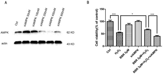 Knocking down the expression of AMPK by siRNA blocked the protective effect of BBR in D407 cells. (A) Cells were transfected with different concentrations of siAMPK for 48 h and the expression of AMPK or β-actin was detected by Western blotting; (B) Cells were transfected with 400 nM siAMPK, transfected cells were seeded in 96-well, 24 h later treated with 3 µM BBR or 0.1% DMSO (vehicle control) for 2 h and then incubated with or without 100 µM H2O2 for another 24 h. Cell viability were measured by MTT assay. * indicates p < 0.05, *** indicates p < 0.001 was considered significantly different.