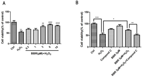 2.1. BBR Reduced H2O2-Induced D407 Cell Death