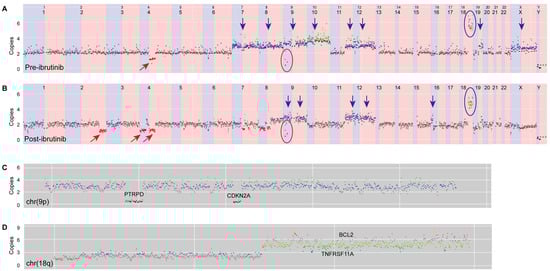 Copy-number changes in (A) pre- and (B) post-ibrutinib samples. Apparent changes are indicated as follows: red arrows—deletions, blue arrows—gains, red rings—homozygous deletions of 9p, and blue rings—amplification of 18q. Further details of post-ibrutinib copy-number changes in chromosomes 9p and 18q are shown in (C,D), respectively. Colored dots represent copy number (black = 0, red = 1, gray = 2, blue = 3, green = 4, olive = 5, pink = 6).
