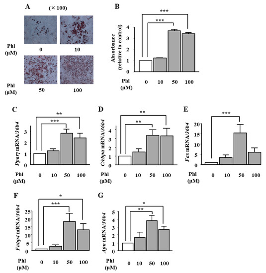 The effects of phloretin on adipocyte differentiation in ST2 cells. (A,B) After reaching confluency, ST2 cells were incubated in adipogenic medium with phloretin (0, 10, 50, and 100 µM), and oil red O staining was performed at day 8. The results are representative of at least seven different experiments. The quantification results are expressed as mean ± SE (n = 6); *** p < 0.001. (C–G) After reaching confluency, the cells were incubated in adipogenic medium. The mRNA expression of adipogenic differentiation markers (Pparγ, C/ebpα, Fas, Fabp4, and Apn) was examined by real-time PCR at day 4. The results are expressed as mean ± SE (n ≥ 5); * p < 0.05, ** p < 0.01, *** p < 0.001. Phl: phloretin.