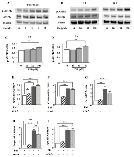 Next, we examined whether AMPK is involved in phloretin-induced adipocyte differentiation in ST2 cells. After ST2 cells were incubated in adipogenic differentiation medium for two days, the effect of phloretin on the phosphorylation of AMPK was examined by western blotting. Treatment with phloretin (100 µM) enhanced the phosphorylation of AMPK (Figure 2A). Moreover, treatment with phloretin (10–100 µM) for 1 and 12 h dose-dependently enhanced the phosphorylation of AMPK (Figure 2B). The quantification of the bands showed that the increase in the ratio of phosphorylated AMPK to total AMPK was significant (Figure 2C,D). The treatment with the AMPK inhibitor ara-A (0.1 mM) alone did not alter the expression of the adipocyte differentiation markers (Figure 2F–I), although it slightly increased Pparγ expression (Figure 2E). Co-incubation with ara-A slightly but significantly suppressed phloretin-induced upregulation of Fabp4 (Figure 2H), whereas the expression of other adipocyte differentiation markers was not affected (Figure 2E–G,I). These findings indicate that the phosphorylation of AMPK may not be associated with phloretin-induced upregulation of adipocyte differentiation markers in ST2 cells.