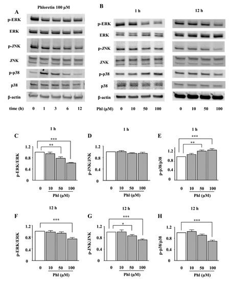 We examined the effects of phloretin on the phosphorylation of MAPKs, i.e., ERK1/2, JNK, and p38 MAPK. ST2 cells were incubated in adipogenic differentiation medium for two days, and then the effect of phloretin on the phosphorylation of MAPKs was examined by western blotting. The treatment with phloretin (100 µM) suppressed the phosphorylation of ERK1/2 and JNK up to 12 h (Figure 3A). Moreover, phloretin dose-dependently decreased the phosphorylation of ERK1/2 and JNK (Figure 3B). The densitometric analysis of the bands showed a significant decrease in the level of phosphorylated ERK1/2 at both 1 and 12 h, and of phosphorylated JNK at 12 h (Figure 3C,D,F,G). On the other hand, the treatment with phloretin (100 µM) transiently phosphorylated p38 MAPK, and, then, suppressed p38 MAPK expression (Figure 3A). Phloretin (10–100 µM) dose-dependently increased the phosphorylation of p38 MAPK at 1 h and decreased it at 12 h (Figure 3B). The densitometric analysis showed that the effects of phloretin on the phosphorylation of p38 MAPK were significant at both 1 and 12 h (Figure 3E,H).