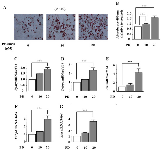 The effects of the MEK inhibitor PD98059 on adipocyte differentiation in ST2 cells. (A,B) After reaching confluency, ST2 cells were incubated in adipogenic medium with the MEK inhibitor PD98059 (0, 10, and 20 µM) for 8 days. Thereafter, oil red O staining and its quantification were performed. The results are representative of at least seven different experiments. The quantification results are expressed as mean ± SE (n = 8); *** p < 0.001. (C–G) After reaching confluency, the cells were incubated in adipogenic medium with PD98059 (0, 10, and 20 µM) for 4 days. The mRNA expression of adipogenic differentiation markers (Pparγ, C/ebpα, Fas, Fabp4, and Apn) was examined by real-time PCR. The results are expressed as mean ± SE (n = 7); *** p < 0.001. PD: PD98059.