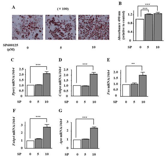 To examine the effect of phloretin-induced JNK inhibition on adipocyte differentiation in ST2 cells, we used the JNK inhibitor SP600125. Oil Red O staining and its quantification showed that the treatment with SP600125 (5 and 10 μM) significantly increased lipid deposition (Figure 5A,B). Moreover, the mRNA expression of Pparγ, C/ebpα, Fas, Fabp4, and Apn was significantly increased by 10 μM SP600125 (Figure 5C–G).