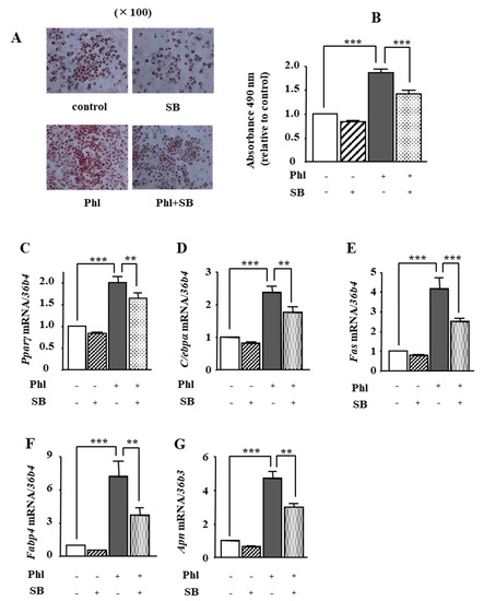 The effects of the p38 MAPK inhibitor SB203580 on phloretin-induced adipogenesis in ST2 cells. (A,B) After reaching confluency, ST2 cells were incubated in adipogenic medium with phloretin (50 µM) and/or SB203580, a p38 MAPK inhibitor (0, 5, and 10 µM) for 5 days. Thereafter, oil red O staining and its quantification were performed. The results are representative of at least seven different experiments. The quantification results are expressed as mean ± SE (n = 6); *** p < 0.001. (C–G) After reaching confluency, the cells were incubated in adipogenic medium with SB203580 (0, 5, and 10 µM) for 4 days. The mRNA expression of adipogenic differentiation markers (Pparγ, C/ebpα, Fas, Fabp4, and Apn) was examined by real-time PCR. The results are expressed as mean ± SE (n = 5); ** p < 0.01, *** p < 0.0011. Phl: phloretin, SB: SB203580.