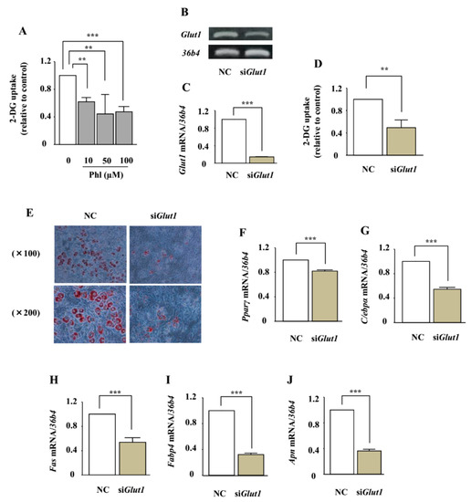 The effect of phloretin on glucose uptake in ST2 cells was measured by using the 2-deoxyglucose (2-DG) colorimetric assay. Treatment with phloretin (10–100 µM) significantly inhibited 2-DG uptake in the cells (Figure 7A). We have previously shown that ST2 cells express only GLUT1, among all the members of the GLUT subfamily [29]. We investigated whether the adipogenic effects of phloretin are mediated by glucose uptake inhibition induced by Glut1 silencing. RT-PCR and real-time PCR showed that Glut1 small interfering RNA (siRNA) significantly suppressed the expression of Glut1 mRNA, compared with the negative control siRNA (Figure 7B,C), and decreased glucose uptake (Figure 7D). In contrast to the effects of phloretin, oil red O staining showed that the knockdown of Glut1 markedly suppressed lipid accumulation (Figure 7E). Furthermore, the knockdown of Glut1 significantly decreased the expression of the adipogenic markers Pparγ, C/ebpα, Fas, Fabp4, and Apn (Figure 7F–J).