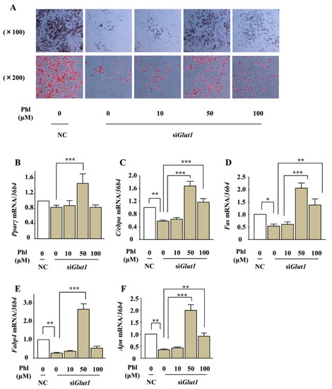 To further investigate the involvement of glucose uptake inhibition in phloretin-induced adipogenesis, we examined the effects of phloretin on lipid deposition and expression of adipocyte differentiation markers in Glut1 knocked-down ST2 cells. After transfection with control or Glut1 siRNA, the cells were incubated in adipogenic medium containing phloretin at a concentration of 0 to 100 μM. Oil red O staining showed that the silencing of Glut1 decreased lipid deposition; on the other hand, treatment with phloretin 10–100 µM increased lipid deposition even in the Glut1 knocked-down cells (Figure 8A). In addition, real-time PCR showed that the silencing of Glut1 significantly decreased the expression of C/ebpα, Fas, Fabp4, and Apn and slightly but not significantly decreased the expression of Pparγ, that treatment with phloretin 50 μM facilitated the expression of Pparγ and Apn, and that phloretin 50 and 100 μM enhanced the expression of C/ebpα, Fas, and Fabp4 in Glut1 knocked-down ST2 cells (Figure 8B–F). These findings demonstrated that phloretin promoted adipogenesis in ST2 cells independent of glucose uptake inhibition.