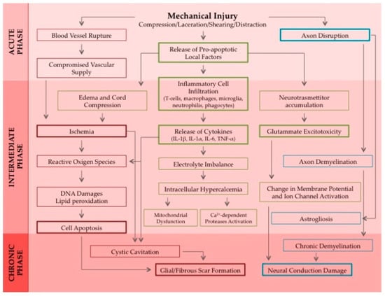 This is a schematic representation of the cascade of events that are included in the pathophysiological response to a spinal cord injury induced by a mechanical trauma. All the phases from the acute to the sub-acute and chronic SCI are being depicted until cavitation occurs in the lesion site and the glial scar forms. Abbreviations used: IL-1α: Interleukin 1α; IL-1β: Interleukin 1β; IL-6: Interleukin 6; TNF-α: Tumor Necrosis Factor α. Figure reprinted with permission from “Nanofiber Scaffolds as Drug Delivery Systems to Bridge Spinal Cord Injury” by Faccendini et al., Pharmaceuticals 2017, 10, 63, licensed under a Creative Commons Attribution license [4].