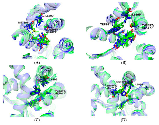 - Liu, H.-L.; Zhong, H.-Y.; Song, T.-Q.; Li, J.-Z. A Molecular Modeling Study of the Hydroxyflutamide Resistance Mechanism Induced by Androgen Receptor Mutations. Int. J. Mol. Sci. 2017, 18, 1823. [Google Scholar] [CrossRef] [PubMed]
