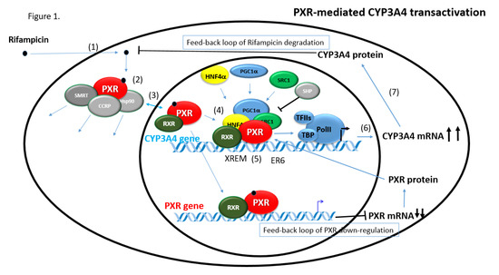 Schematic picture of pregnane X receptor (PXR)-mediated regulation of CYP3A4 gene expression. In the regulation, two feedback loops are involved. First, PXR triggers CYP3A4 mRNA transcription resulting in CYP3A4 protein synthesis in the cytosol. Subsequently, cytosolic CYP3A4 metabolically inactivates rifampicin, a substrate of CYP3A4. In the second feedback loop, activated PXR downregulates its own expression via the PXR (NR1I2) gene promoter. A potential third proposed feedback loop (not shown) supposes that PXR downregulates Small heterodimer partner (SHP) expression. SHP is a corepressor of PXR [49]. (1) passive diffusion of a ligand into cells; (2) binding to PXR that forms a cytoplasmic complex with chaperones (Hsp90), CCRP, and SMRT. The binding to a ligand promotes release of these proteins from PXR; (3) cytoplasm-nuclear translocation; (4) binding of coactivators and other nuclear receptors (such as RXRα) to form a transcriptional complex; (5) binding of the complex to PXR response elements in target genes’ promoter regions; (6) recruitment of transcription machinery factors and mRNA synthesis; (7) export of mRNA into cytosol and translation. HNF4α, hepatocyte nuclear factor 4α, a nuclear receptor that coactivates human PXR (hPXR); PGC1α, Peroxisome proliferator-activated receptor gamma coactivator 1-alpha, a coactivator of PXR; PolII, RNA polymerase II; TBP, TATA-binding protein; TFII, transcription factor II D.