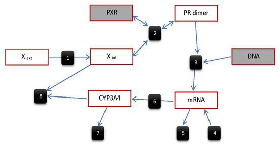 The first quantitative (semi-)mechanistic biologically based compartmental model for PXR-mediated human CYP3A4 gene regulation has been described in the report by Luke et al. [90]. A schematic representation of the modelled processes is given in Figure 2, which can also be found in Luke et al. [90].